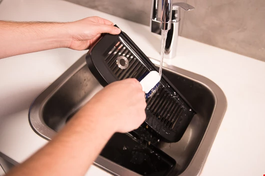 Haal het rooster van de lekbak af en gooi de lekbak leeg in de gootsteen. Reinig de lekbak én het rooster onder stromend water met een afwasborstel en maak ze vervolgens droog met een schone doek.