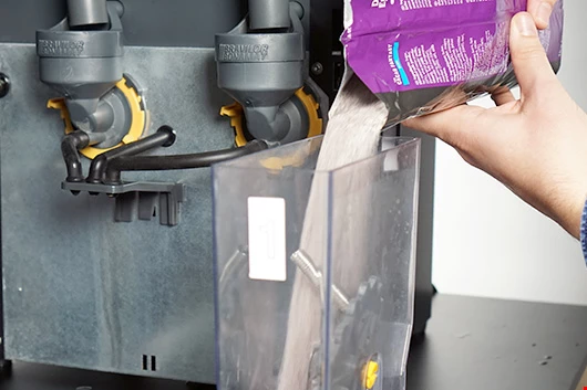 Plaats de container terug. Zorg dat de uitgiftetuit goed in de mengbeker valt. De gele uitloop kun je naar voren trekken om het ingrediënt open te zetten voor gebruik.