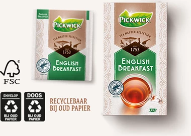 Pickwick Tea Master Selection is speciaal voor de bewuste, duurzame genieter. Pickwick TMS bestaat uit gecertificeerde thee, de verpakkingen zijn verantwoord ingekocht en na gebruik gemakkelijk recycleerbaar. Tevens is het theezakje plastic-vrij en daardoor volledig composteerbaar.